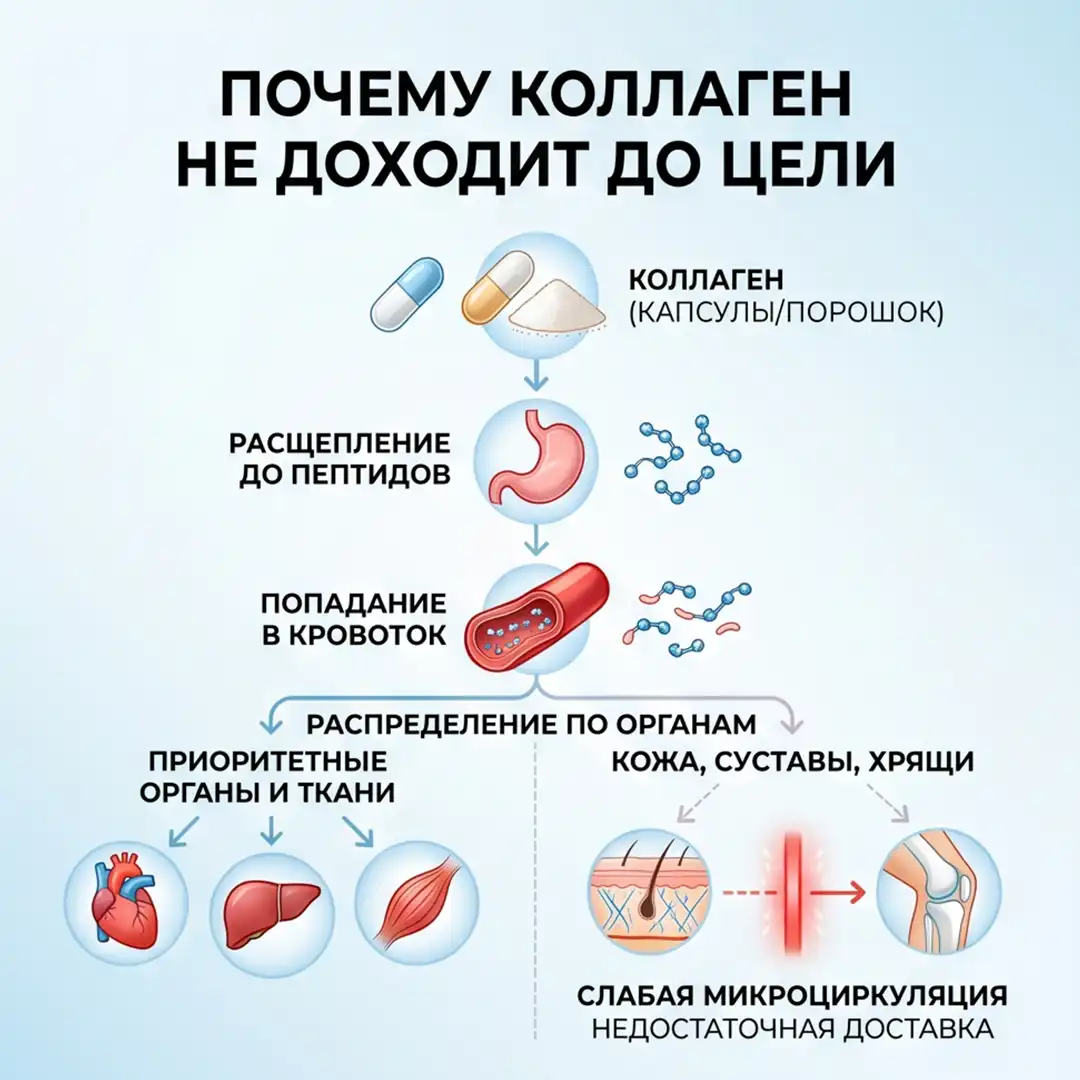 Вы принимаете коллаген. Пептиды попадают в кровь. Но дальше — как машина скорой помощи, которая едет по пробкам. Может, и доедет, но не вовремя и не в полном составе.