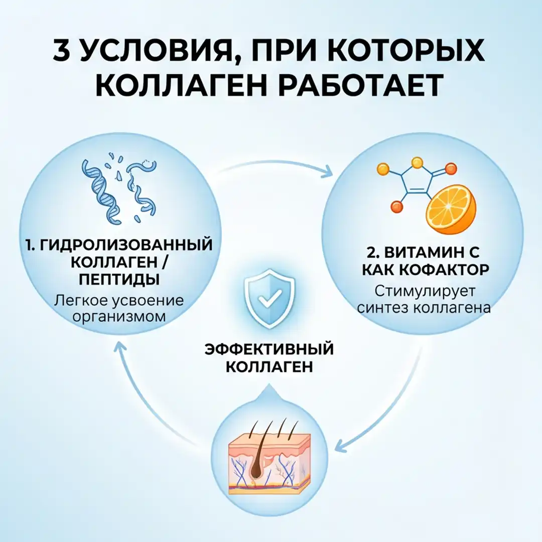 Большинство коллагеновых добавок закрывают первые два условия. Третье — игнорируют полностью.
